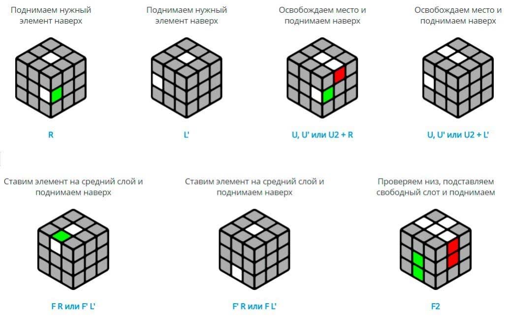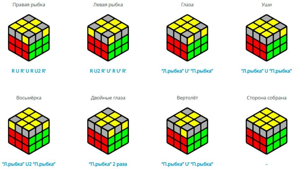 Каждый выполняется в 2 этапа: первая половина до правильной ориентации углового кубика, вторая половина (после поворота) до возвращения порядка в нижних слоях.
