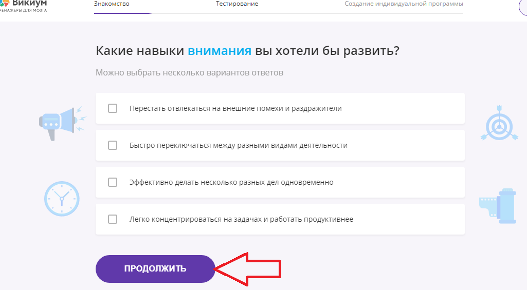 - После этого откроется еще одна страница знакомства, на которой нужно выбрать, какие навыки памяти вам хотелось бы в себе развить. Выберите один или несколько вариантов. Затем кликните «Продолжить».