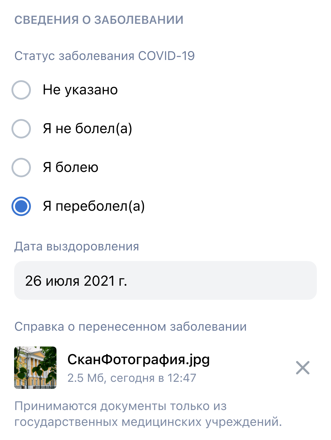 - статус «Я переболел(а)» указывается в том случае, если вы переболели COVID-19 и у вас есть подтверждающий документ о выздоровлении/наличии антител к COVID-19. При выборе статуса необходимо в обязательном порядке указать дату выздоровления согласно имеющемуся документу, а также приложить фото/скан самого документа.