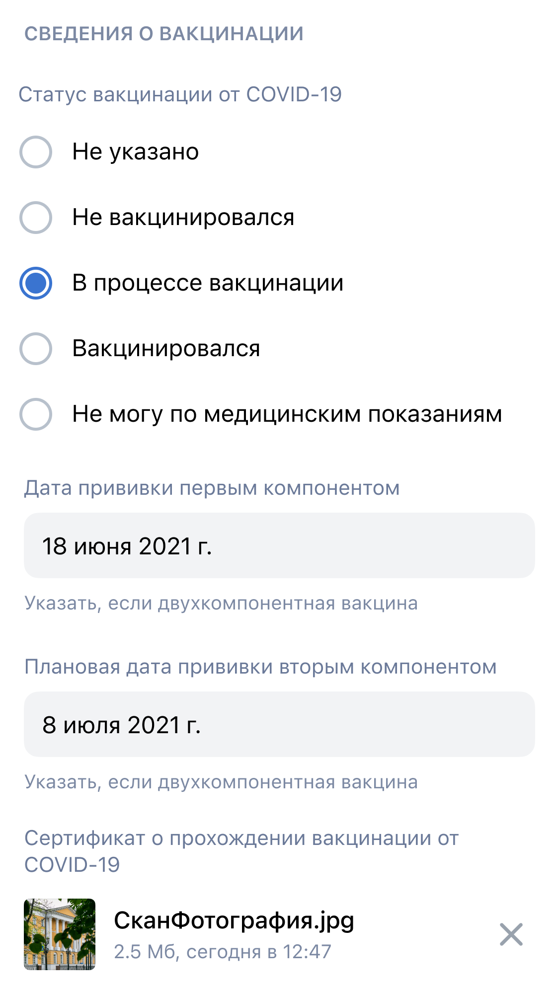 - статус «Вакцинировался» необходимо указывать в том случае, если вы прошли вакцинацию однокомпонентной вакциной или сделали две прививки двухкомпонентной вакцины. При выборе статуса необходимо указать дату прохождения вакцинации однокомпонентной вакциной либо дату вакцинации второй прививкой для двухкомпонентной вакцины, а также прикрепить фото/скан полученного сертификата;