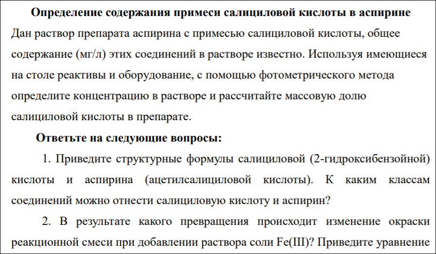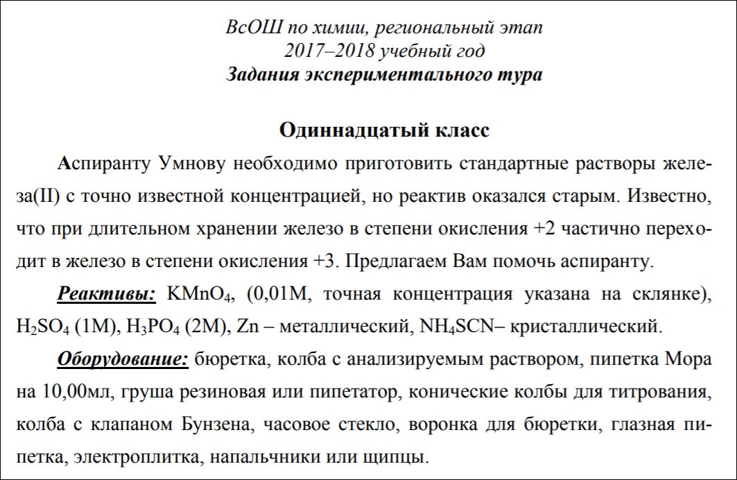 3. Региональный этап — только для учеников 9–11 классов, проходит в январе. Здесь добавляется ещё один тур — практический. В теоретической части 6 задач, там можно набрать максимум 100 баллов. На практическом этапе мне попалось задание на количественный анализ — здесь можно набрать максимум 40 баллов.
