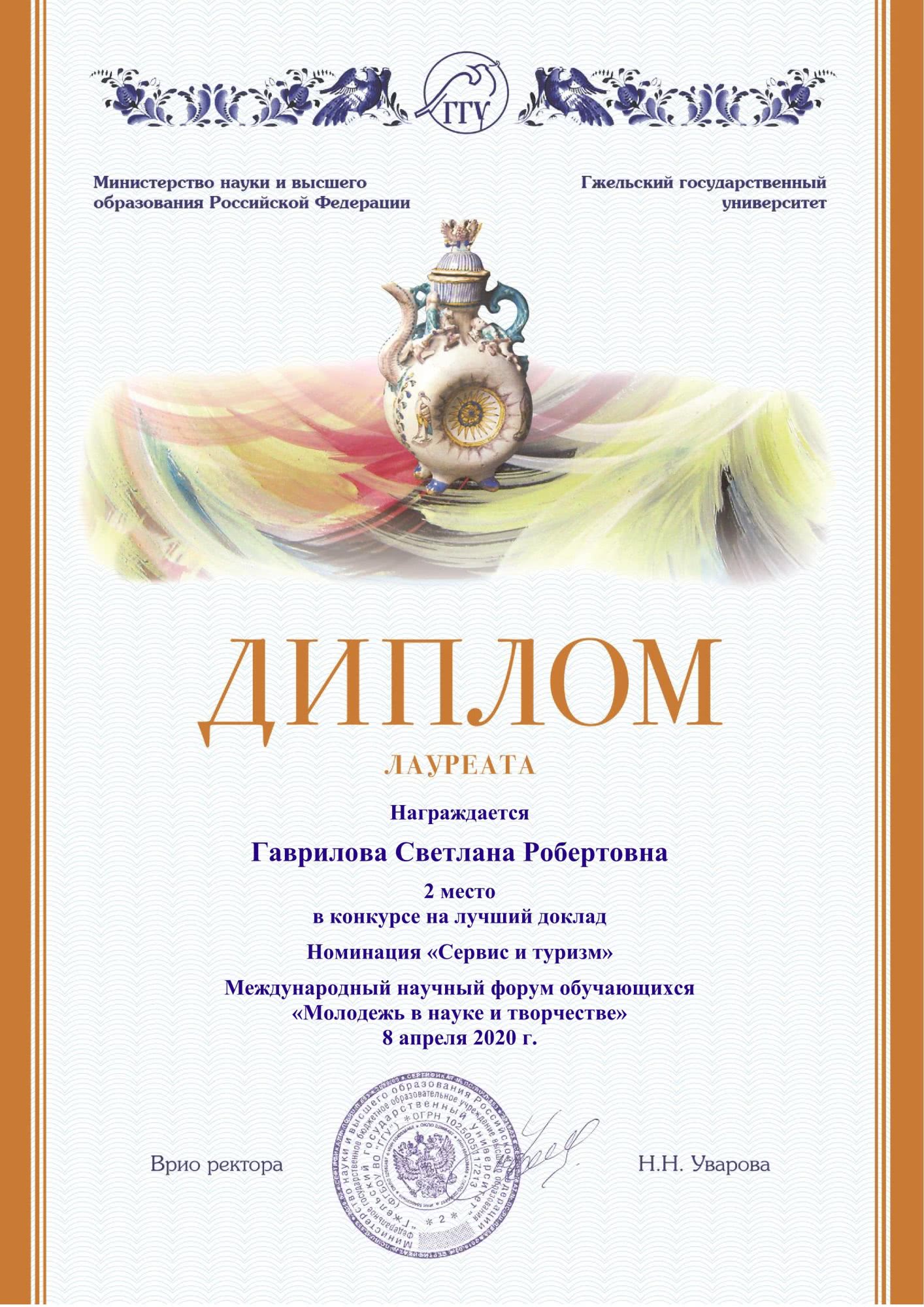 Студентка Гаврилова Светлана стала лауреатом Международного научного форума обучающихся «Молодежь в науке и творчестве», прошедшего в апреле 2020 г. в г. Гжель