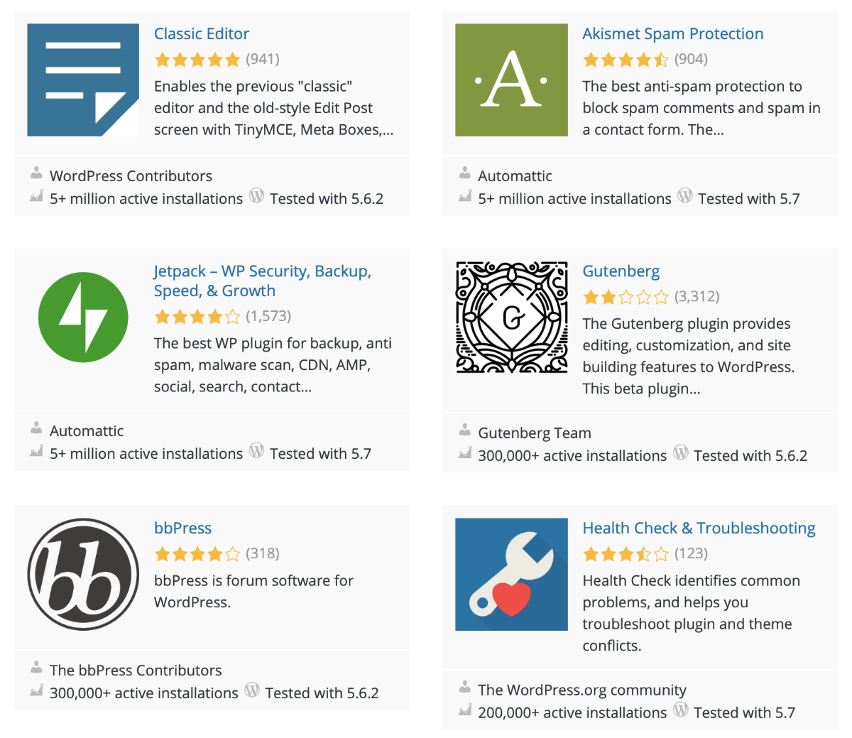 Плагины для WordPress значительно расширяют базовый функционал платформы, на март 2021 года в ее каталоге имеется почти 58 000 плагинов. Все они распределены по категориям для удобства поиска и выбора. Например, можно выбрать совместимые с блоками плагины, популярные плагины, рекомендуемые плагины, бета-плагины и т.д. Пользователям доступен поиск плагинов по названию, также есть опции создания и добавления новых плагинов в базу. Каждый плагин снабжен описанием, рейтингом, отзывами, количеством установок и информацией о совместимости с разными версиями WordPress.