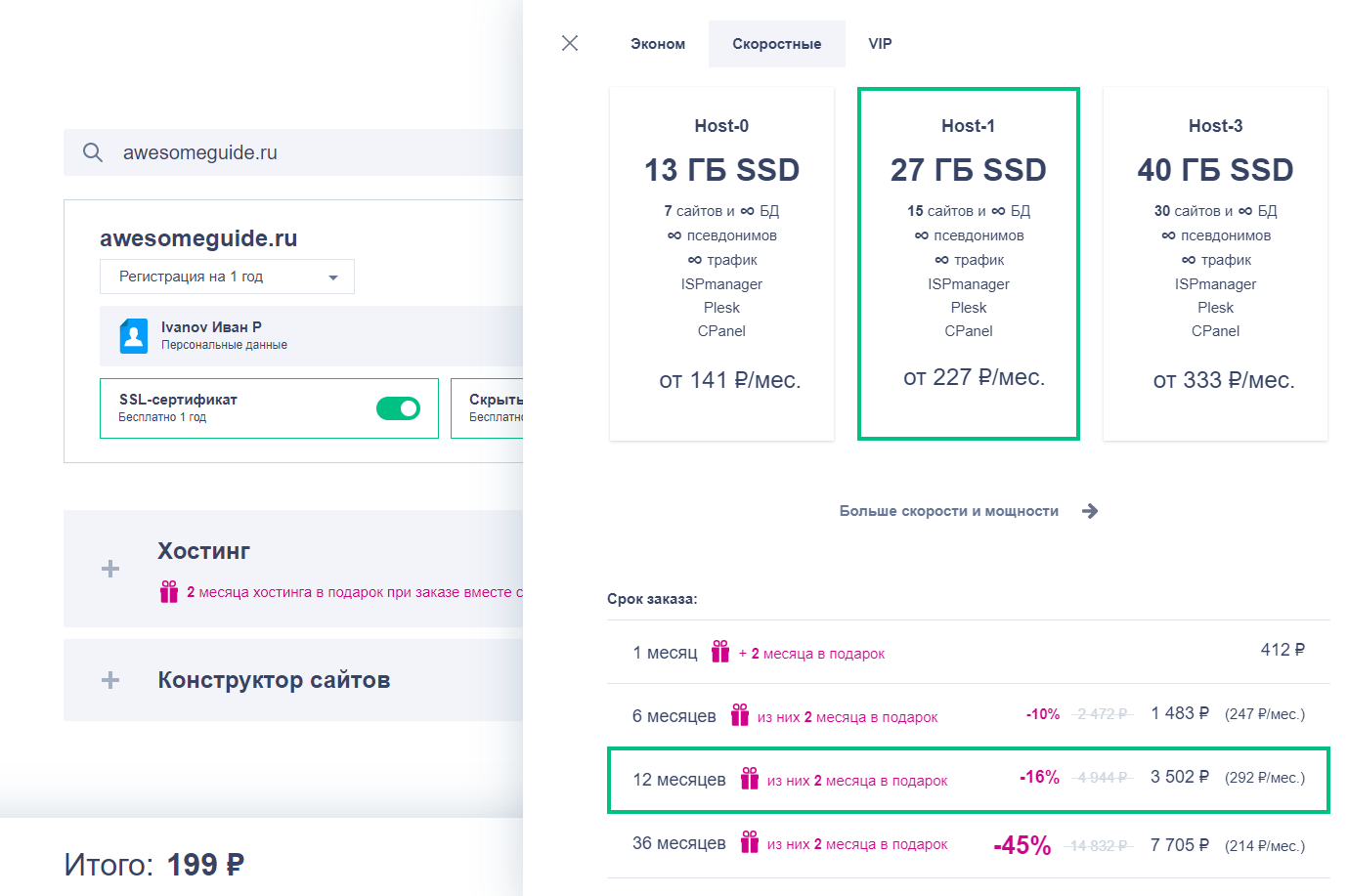 На предыдущем шаге вы нажали кнопку «Зарегистрировать», и у вас должен был открыться мастер заказа, в котором можно сразу же приобрести хостинг и SSL.