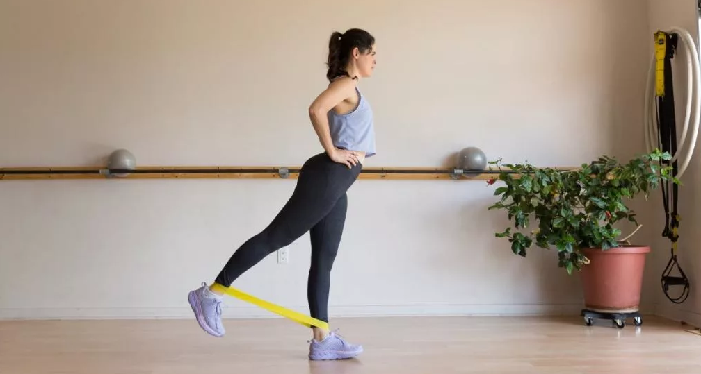 Резинка находится немного выше, чем уровень коленей. Исходное положение – стоячее, ноги должны быть на ширине плеч. Выпад делается не только назад, но и в сторону. Колено опускается до появления прямого угла.