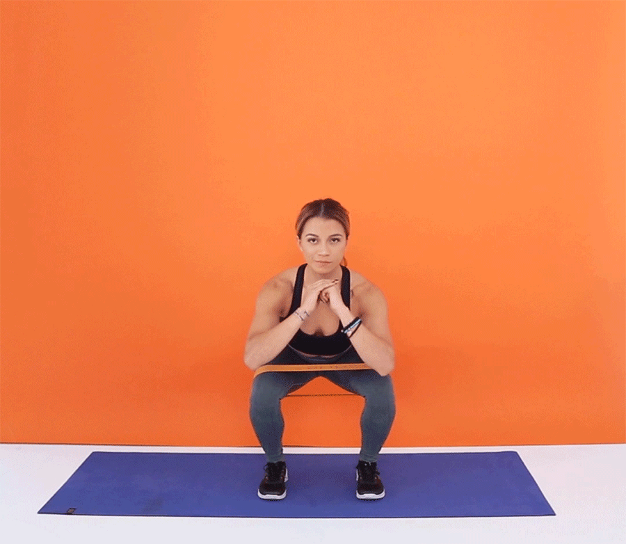 Чтобы эффект от упражнения был максимальным, делать их стоит глубоко. Резинка располагается так же, как и в прошлом упражнении. Стоять нужно так, чтобы ноги были расставлены по ширине плеч. Приседания делаются до тех пор, пока бедра не будут расположены параллельно полу. Таз отводится слегка назад, угол в колене должен быть прямым.
