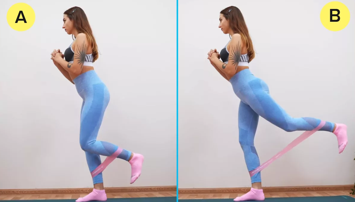 С помощью такого упражнения с резинкой для женщин для ягодиц вы сможете быстро улучшить их внешний вид. Выполнять его легко. В этом вам не потребуется помощь. Резинку нужно разместить на уровне щиколоток. Выпрямите спину, и напрягите пресс. Следите за тем, чтобы не было прогиба в пояснице. Для этого можно немного подкрутить таз вниз. Станьте на одну ногу, а вторую отведите назад. Колени не сгибайте.